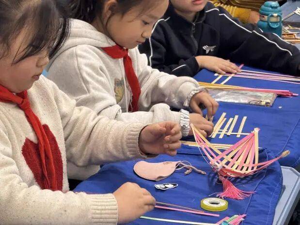 三、四年级学生们“玲珑手”,专注地编织中国结、制做小灯笼。一件件精彩的手工做品,不只熬炼了脱手能力,更传送出对新年夸姣的祈愿。