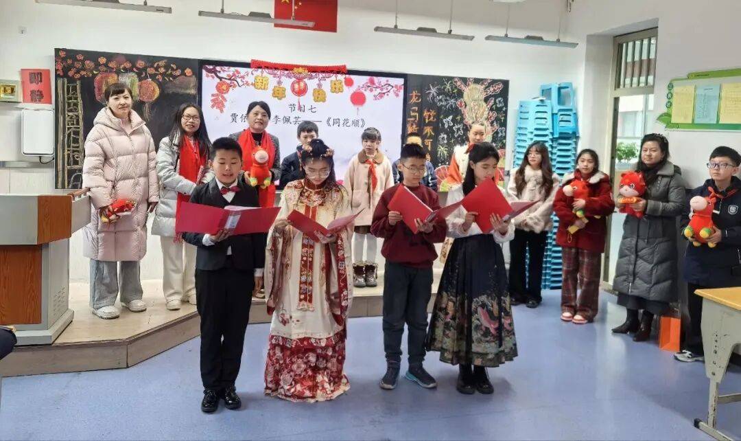 文艺表演取互动逛戏环节同样迭起。小演员们身着汉服登台表态,朗诵《少年中国说》时气焰澎湃,技击表演刚劲无力,跳舞《祖国的花朵》灵动活跃,歌曲《中华五千年》委婉悠扬,一个个细心编排的节目博得阵阵掌声;“伐鼓传花”逛戏中,彩花正在孩子们手中快速传送,接到花的同窗奉上实诚的新年祝愿,欢声笑语回荡正在教室的每个角落。