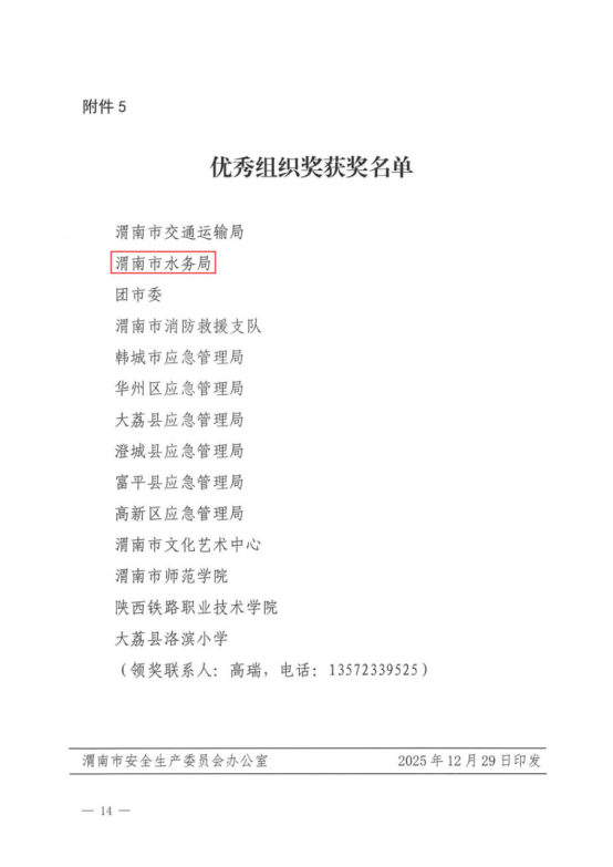 全市首届应急科普大赛系列勾当由市安委办组织开展,内容包罗平安出产从题书法和绘画、应急科普宣传海报大赛,遭到各级应急办理部分、企事业单元及泛博群众快乐喜爱者的关心,汇集了一多量优良的从题艺术做品。本次勾当市水利系统共有15件做品参赛,此中荣获平安出产从题书法做品二等1项、三等1项、优良做品3项,从题绘画做品三等1项。市水务局荣获优良组织。