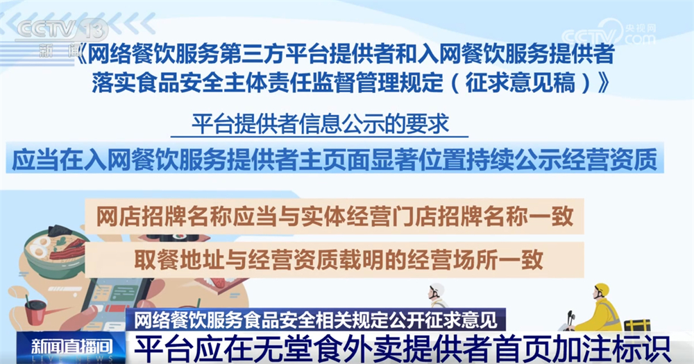 收罗看法稿明白平台供给者消息公示的要求,该当正在入网餐饮办事供给者从页面显著持续公示运营天分,网店招牌名称该当取实体运营门店招牌名称分歧,取餐地址取运营天分载明的运营场合分歧。对于无堂食外卖供给者,平台该当正在网店首页加注“无堂食”标识。